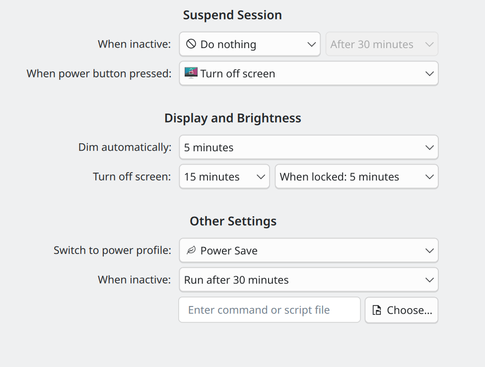 Still on KDE ... though something more lightweight has appeal. I have asked in another thread about Hyprland. Where is "Screen off but don't sleep" setting?